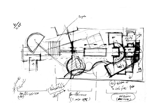 The design blends traditional Persian architectural motifs, such as arches and courtyards, with modern, abstract design principles.